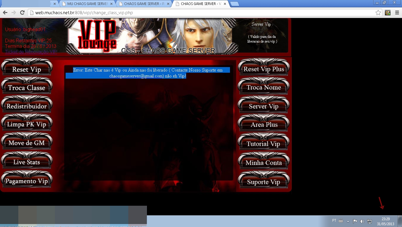 Pô, venho aqui pedir, ou melhor implorar, por favor, resolvam meu problema! meu char bighead01 não quer resetar no painel vip, ou melhor só com ele que não consigo usar os comandos do painel, diz que ele não é vip. só me restam 20 dias de vip plus, e não conseguir aproveitar nada, porque tenho que resetar no lvl 400 e no painel free. Por favor, Ja mandei suporte e nada resolve.