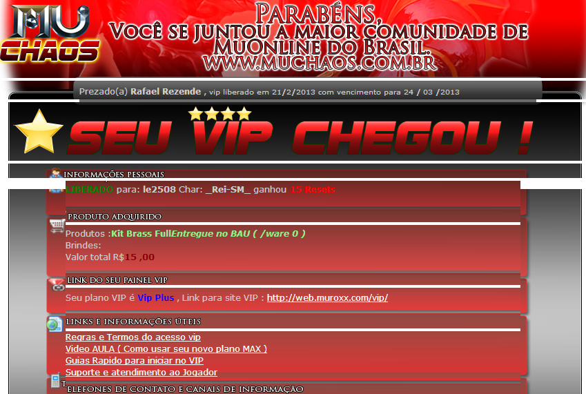 Winner79 escreveu:Olha R4F4EL eu aconcelho voce a mandar 1 Suporte para o Rafael (Lotus-GM) E enviar 1 pedindo de suporte Sobre oq aconteceu Eu ja tive 1 conta hakiada e recuperei mandando suporte pos o cara tinha trokado os dados com (MAX VIP) as veses o seu tbm poder ter sido assim envie 1 suporte : http://sac.muchaos.net.br/tela.login.php?aviso=logado : explique oq acontceu :!: