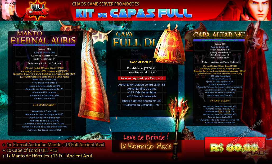 Descriçao As Novas Capas e Manto FULL ANCIENT de MG e DL com opcoes amarelas, bonus de reducao de dano ,aumento de HP e funciona como Asa. Melhore sua performance nos duelos e eventos com estas adicoes incriveis ao seu armario de armas e armaduras! Um dos pacotes mais pedidos pelos jogadores, agora disponivel para compra avulsa. Inclui 35 MaxCreditos e 35 resets. |