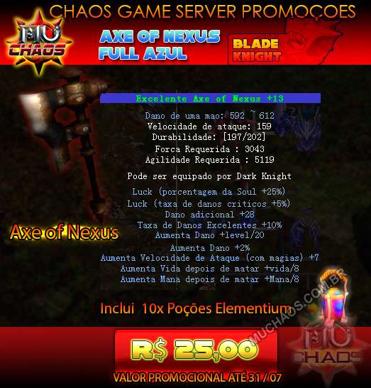 Descriçao Axe Nexus Full Azul, nova arma , leve e poderosa, ideal para BKs em Duelos e ganhe 10x Potion Elementium que aumenta sua força e defesa em 10% |