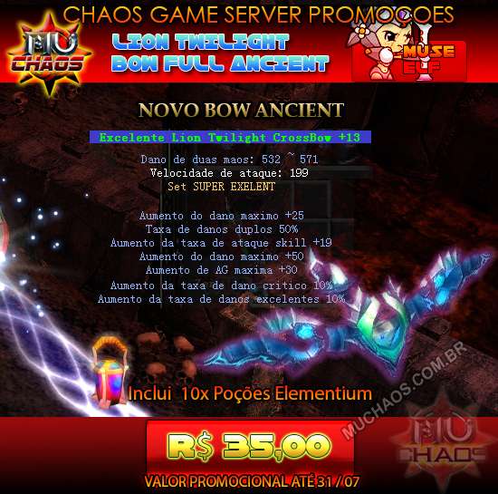 Descriçao As Novas Capas e Manto FULL ANCIENT de MG e DL com opcoes amarelas, bonus de reducao de dano ,aumento de HP e funciona como Asa. Melhore sua performance nos duelos e eventos com estas adicoes incriveis ao seu armario de armas e armaduras! Um dos pacotes mais pedidos pelos jogadores, agora disponivel para compra avulsa. Inclui 35 MaxCreditos e 35 resets. |